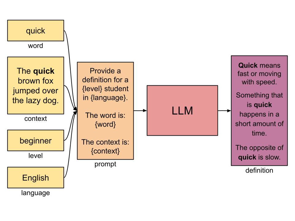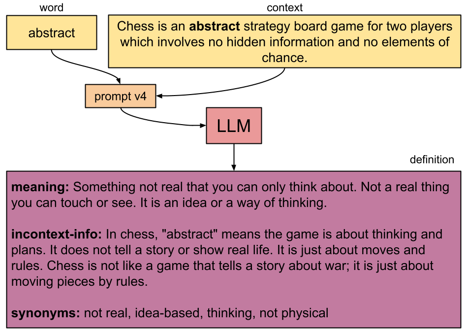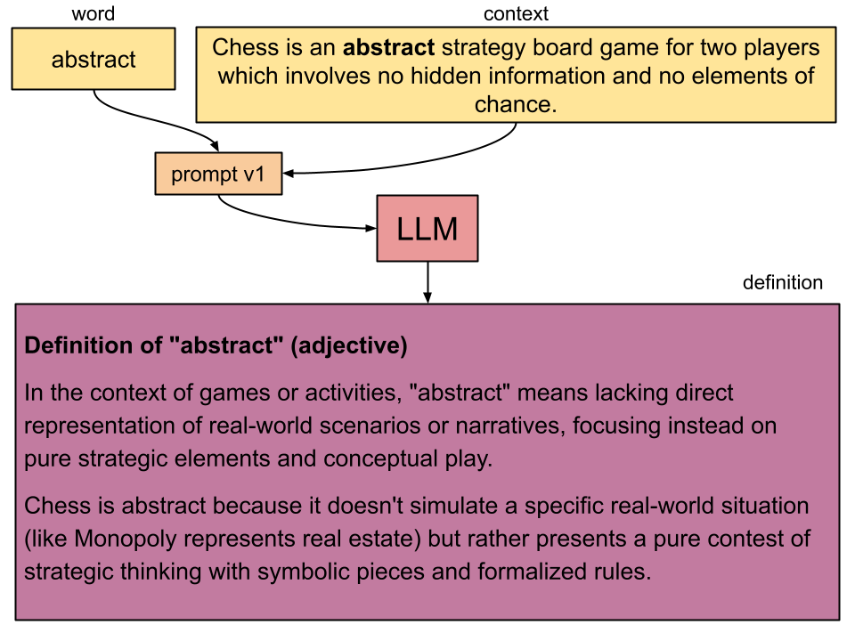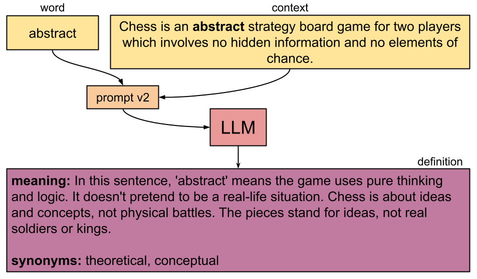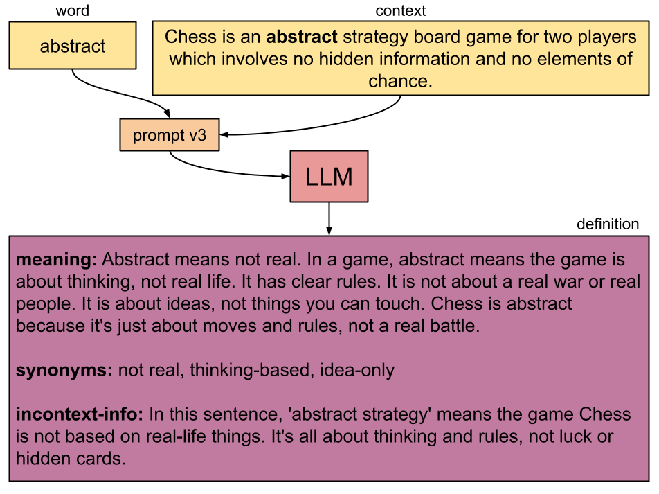A notable addition in this iteration is the incontext-info section. This was a crucial insight that I stumbled upon while iterating the prompt that really improved the quality of the definitions. For example, in the phrase “don’t be a chicken” I wanted the definition of chicken to be “bird” and the incontext-info to be “coward.” Not separating these two often led to unclear or misleading definitions.