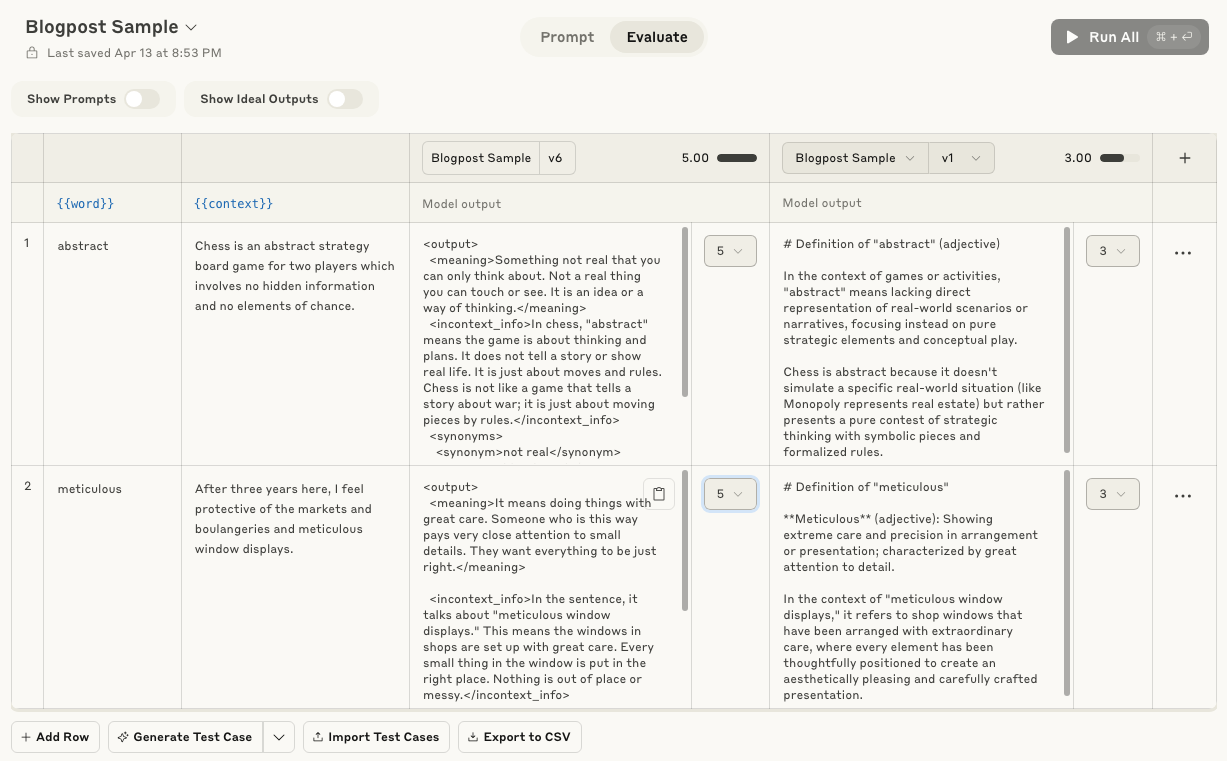 The second challenge of organizing the prompts and outputs is actually the easiest to solve. I used Anthropic’s Evaluation Tool which is built explicitly for the purpose of systematizing evaluation through different versions.3